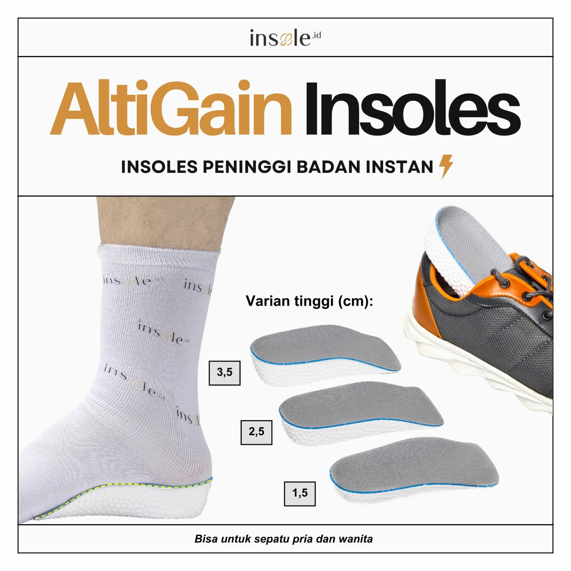 A: AltiGain Insoles cocok untuk berbagai jenis sepatu yang tertutup sampai belakang. Untuk varian tertinggi (3,5 CM), disarankan untuk digunakan pada sepatu boots.